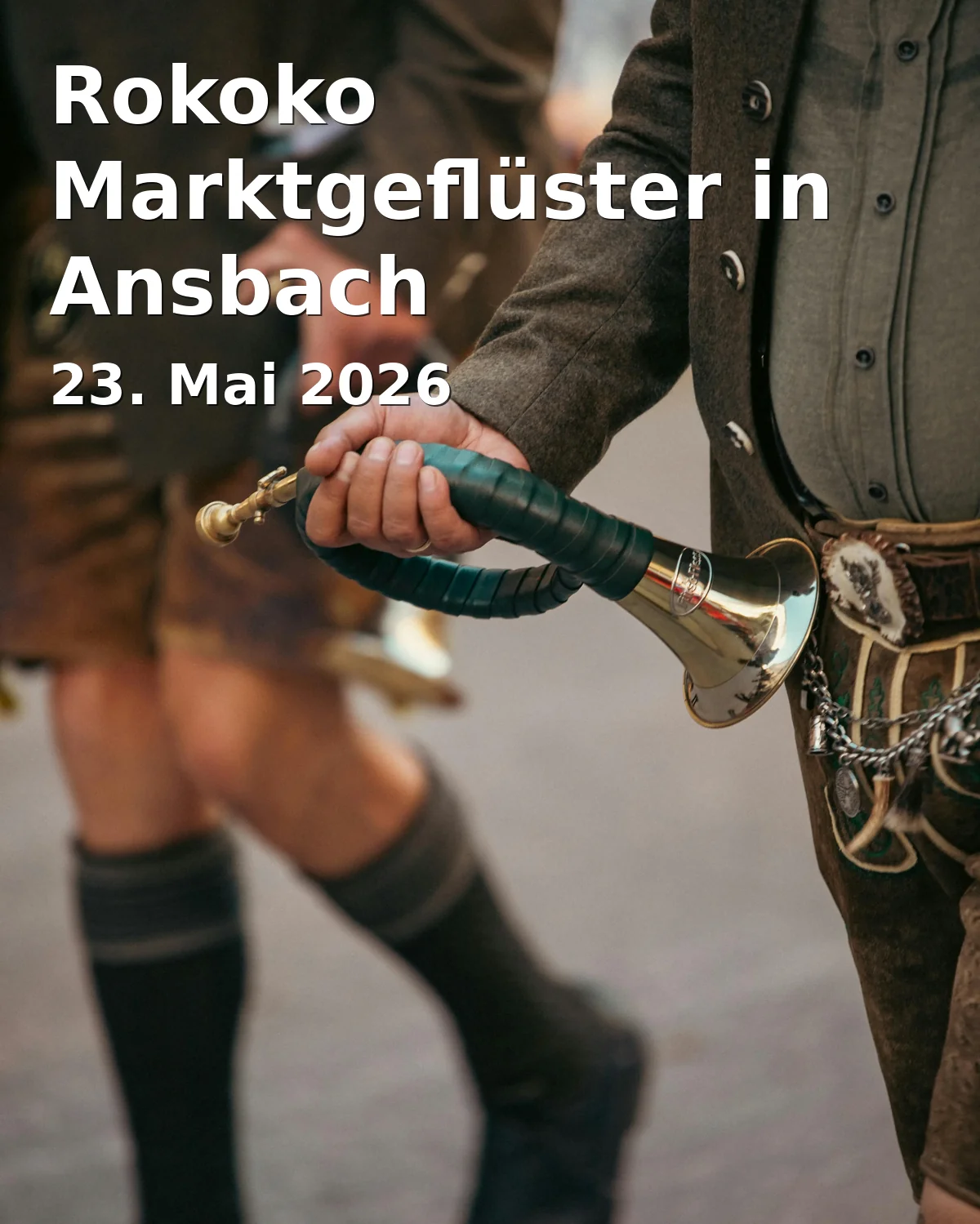 Erleben Sie am 23. Mai 2026 das einzigartige Rokoko Marktgeflüster in der wunderschönen Altstadt von Ansbach. Diese Veranstaltung verspricht ein Fest für alle Sinne zu werden, indem sie die barocke Atmosphäre mit traditionellen Handwerken und historischen Figuren vereint. Als Teil der beliebten Rokoko-Reihe des Jahres 2026 zieht dieses Event Liebhaber der Geschichte und des Kulturerbes aus der ganzen Region an.